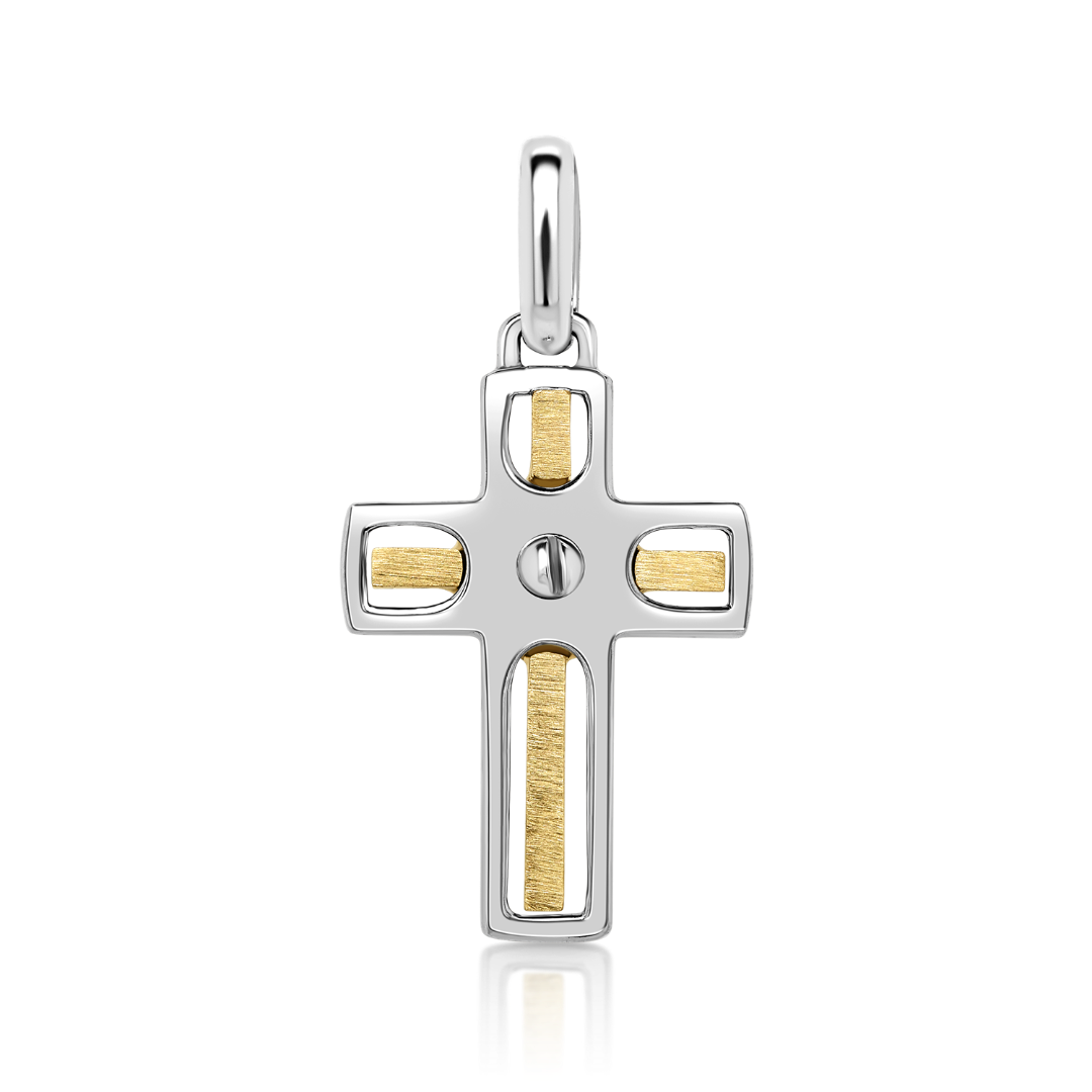 Pandantiv cruce din aur alb de 14K cu elemente din aur galben.
