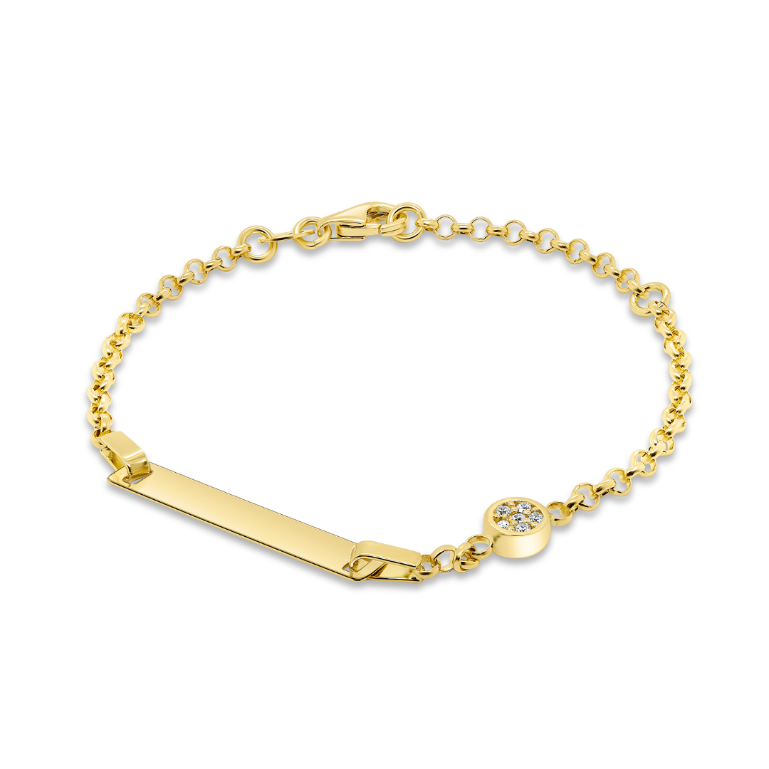 Brățară pentru copii din aur galben de 14K, cu plăcuță și element cu pietre cubic zirconia.