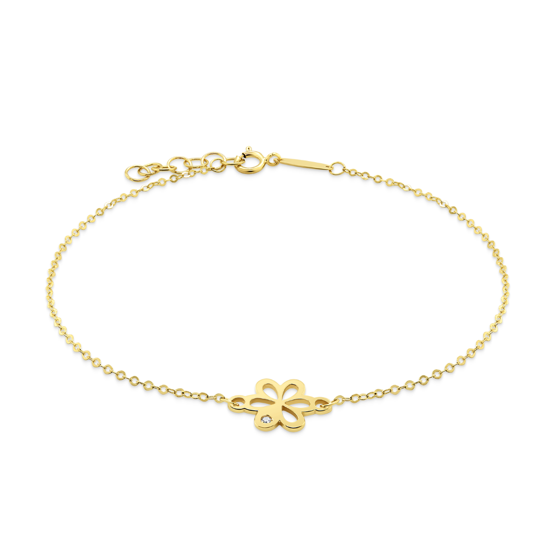Brățară din aur galben de 14K, cu piatră Cubic Zirconia și pandantiv în formă de floare.