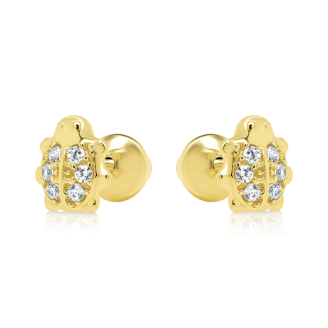 Cercei din aur galben de 14K, model buburuză, cu pietre Cubic Zirconia albe.