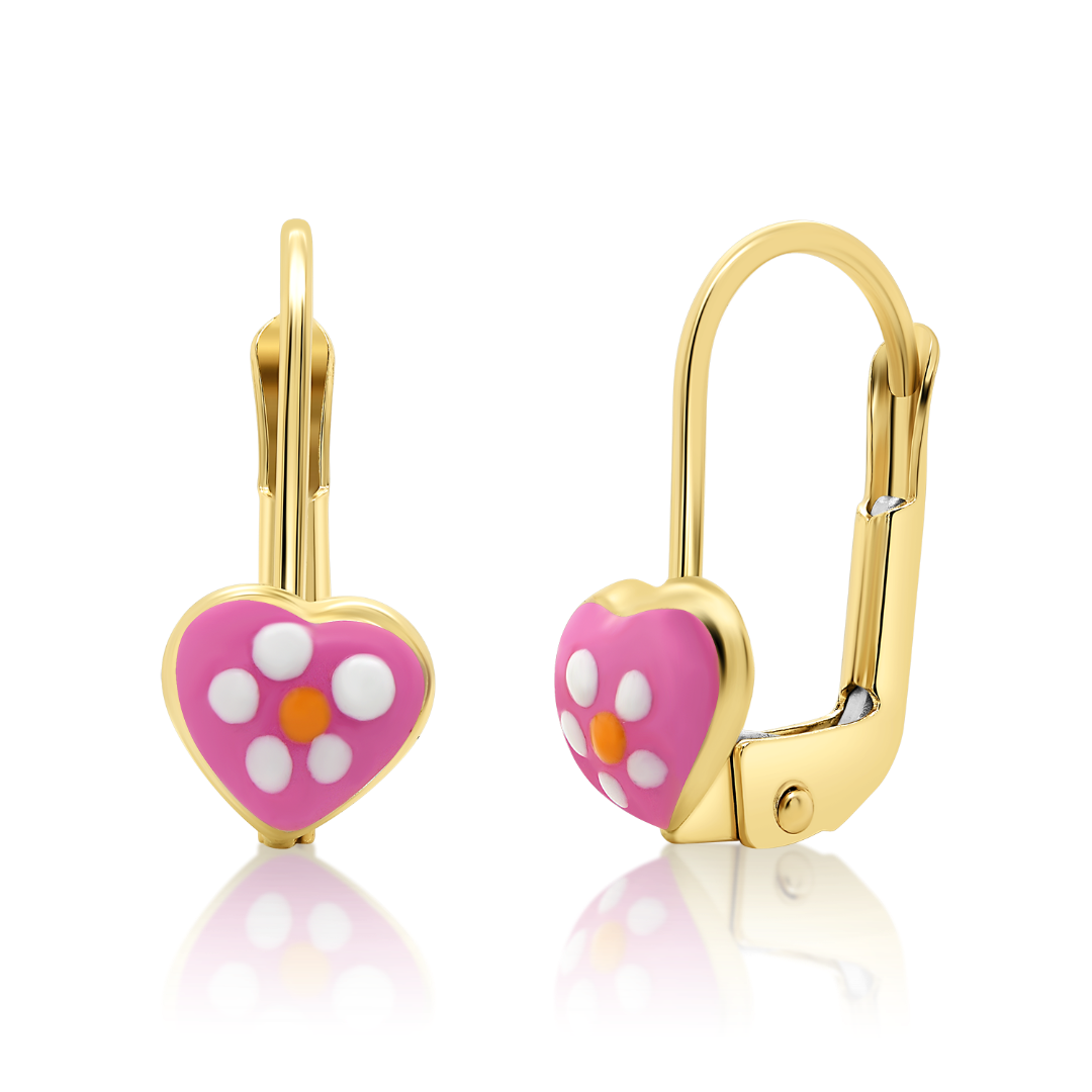 Cercei din aur de 14K pentru fetiță cu element tip inimă și floare cu email.