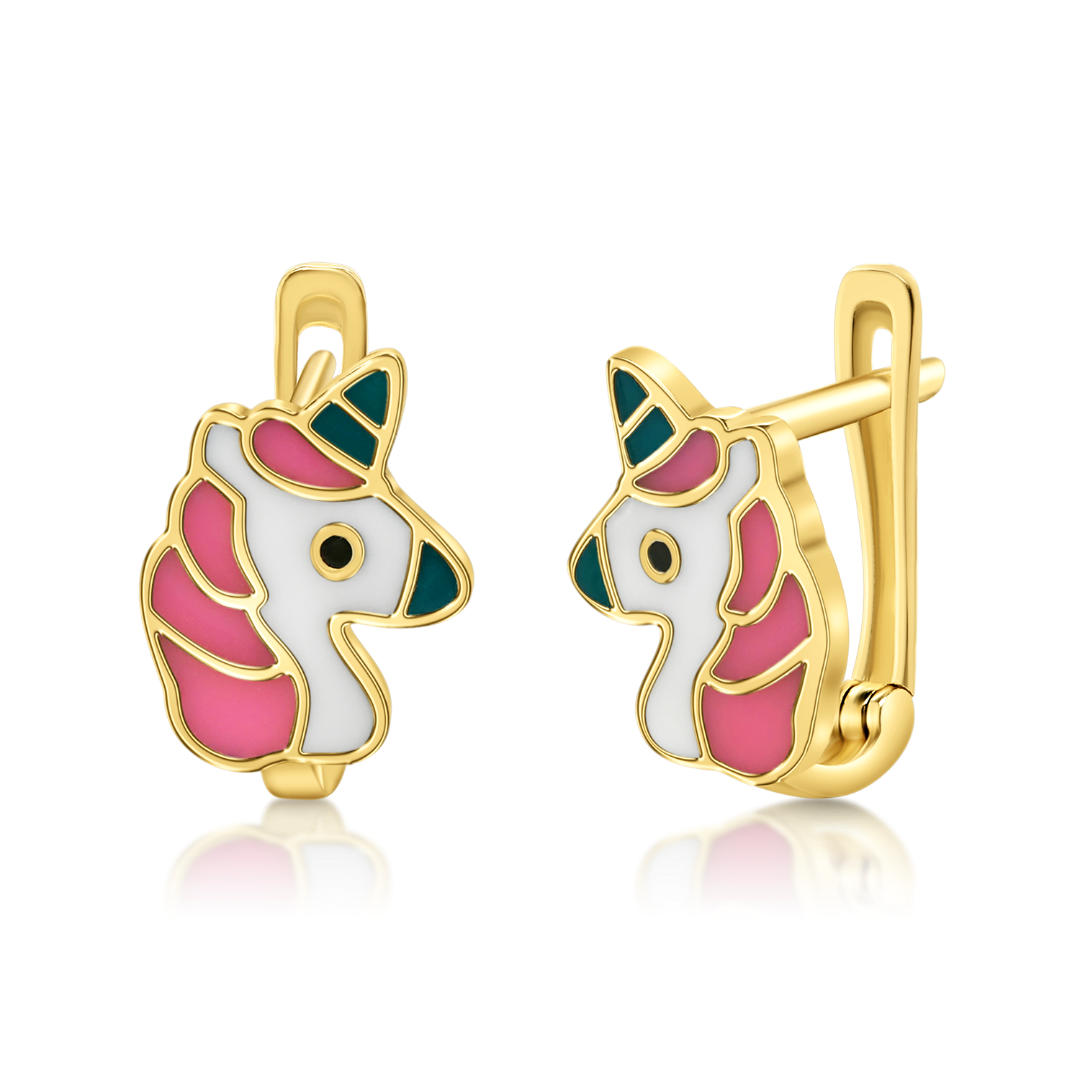 Cercei unicorn din aur galben de 14K cu Email colorat.