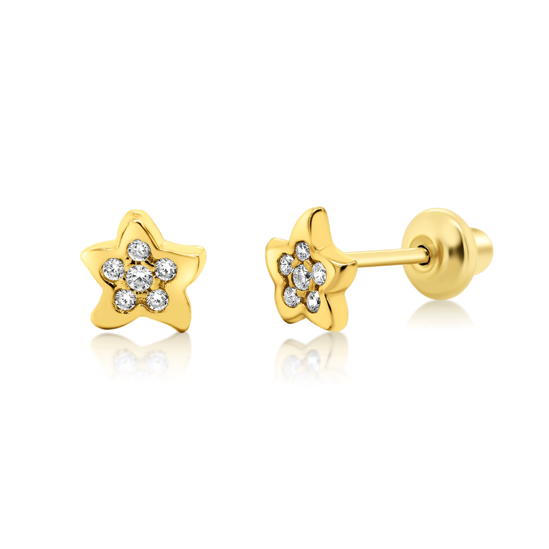 Cercei pentru copii din aur galben de 14K, cu pietre zirconia și închidere cu protecție.