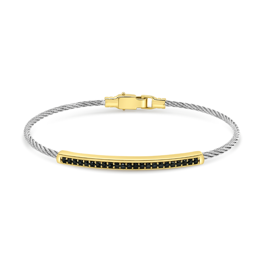 Brățară cu model împletit din aur alb și element din aur galben cu pietre Cubic Zirconia negre.