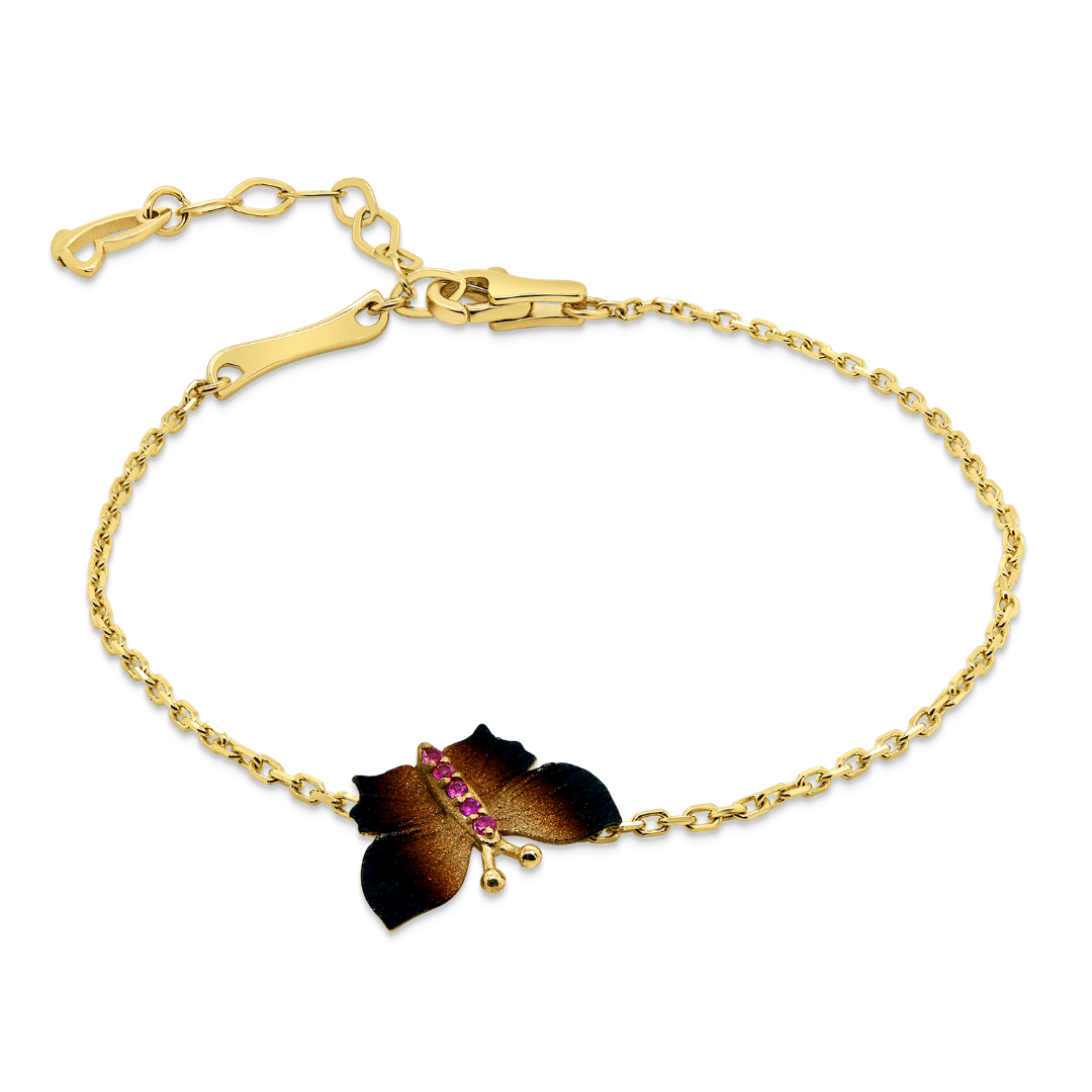 Brățară din aur galben de 14K, cu pandantiv fluture și Safire roz.