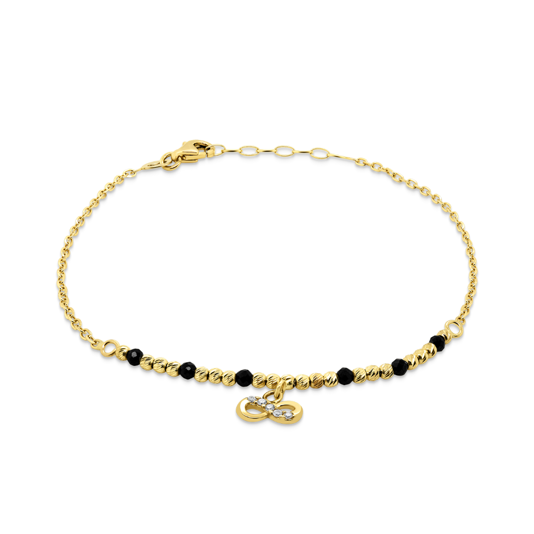 Brățară reglabilă din aur galben de 14K, cu pietre Cubic Zirconia albe, pandantiv infinit și bilute negre.