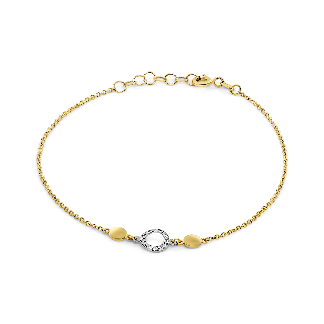 Brățară din aur galben de 14K cu elemente rotunde și pandantiv fațetat în formă de cerc din aur alb.