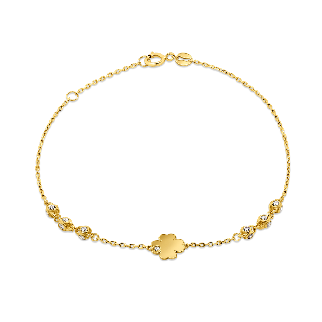 Brățară din aur galben de 14K, cu pandant în formă de trifoi și elemente rotunde cu pietre cubic zirconia.