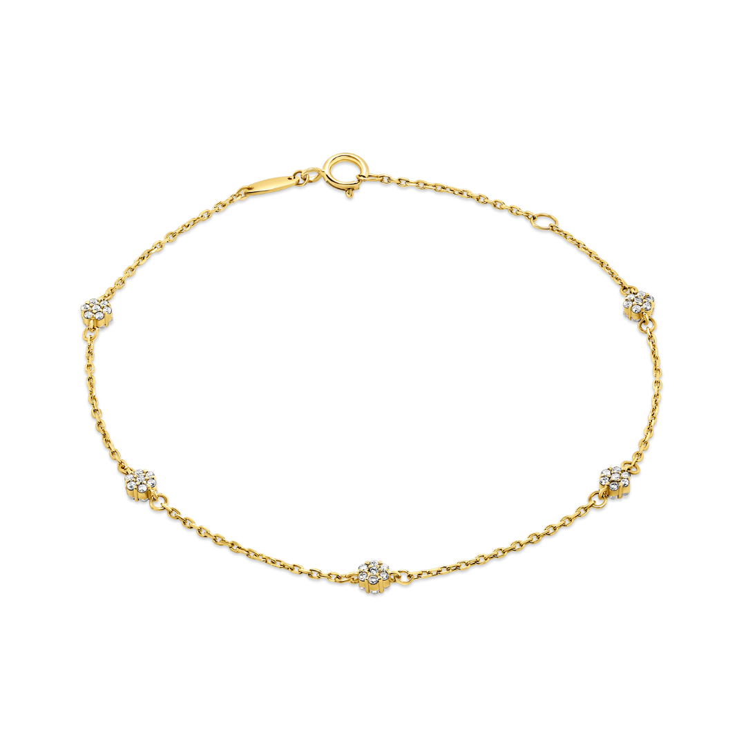 Brățară din aur galben de 14K, cu elemente în formă de floare și pietre cubic zirconia incolore.