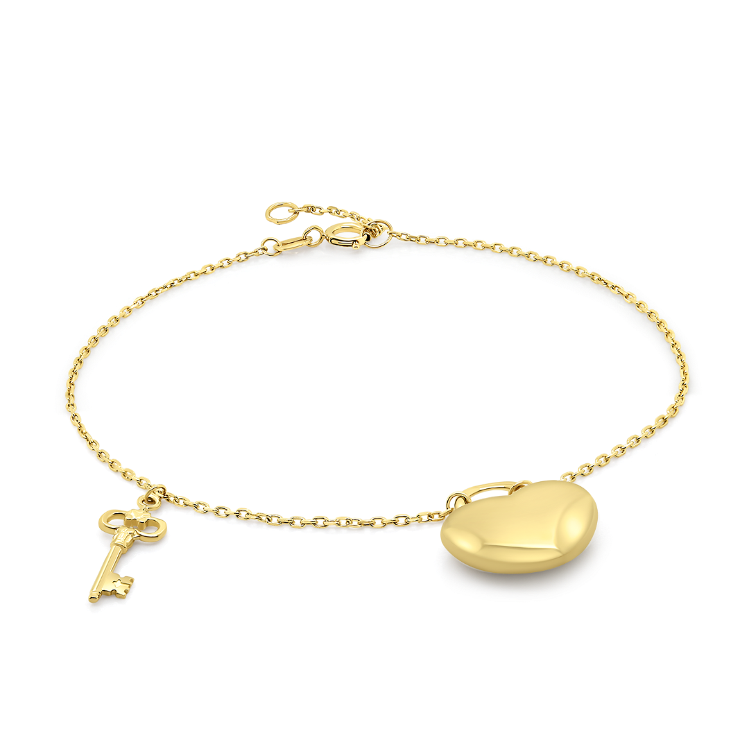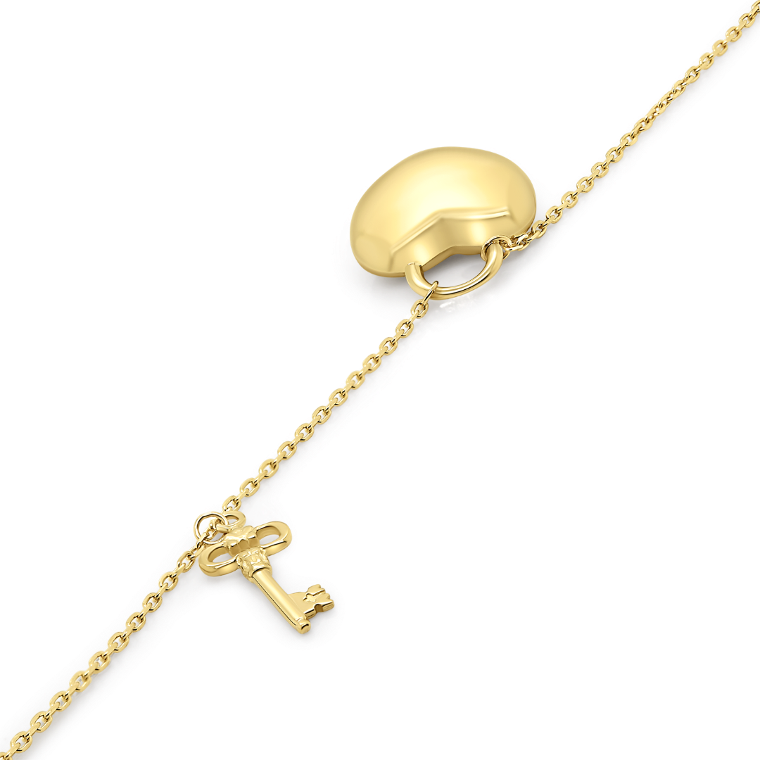 Brățară din aur galben de 14K cu pandantive lacăt în formă de inimă și cheie.