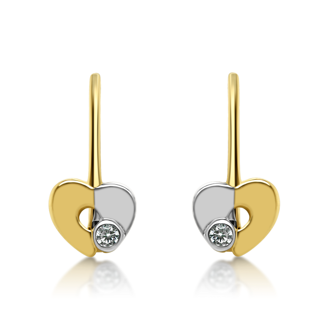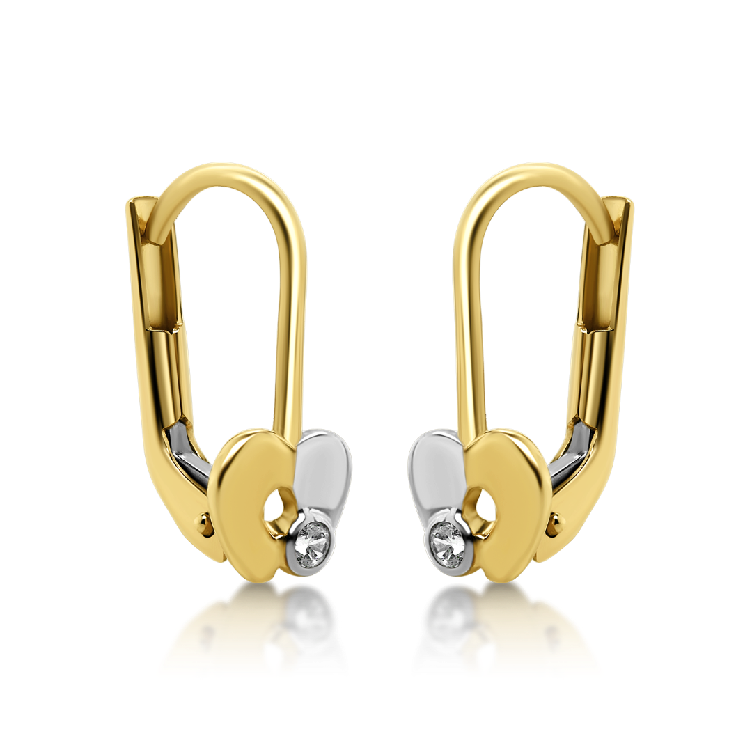 Cercei pentru copii din aur galben de 14K cu element din aur alb și pietre cubic zirconia.