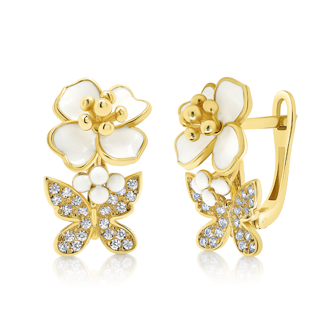 Cercei din aur galben de 14K, cu Email alb și pietre Cubic Zirconia.