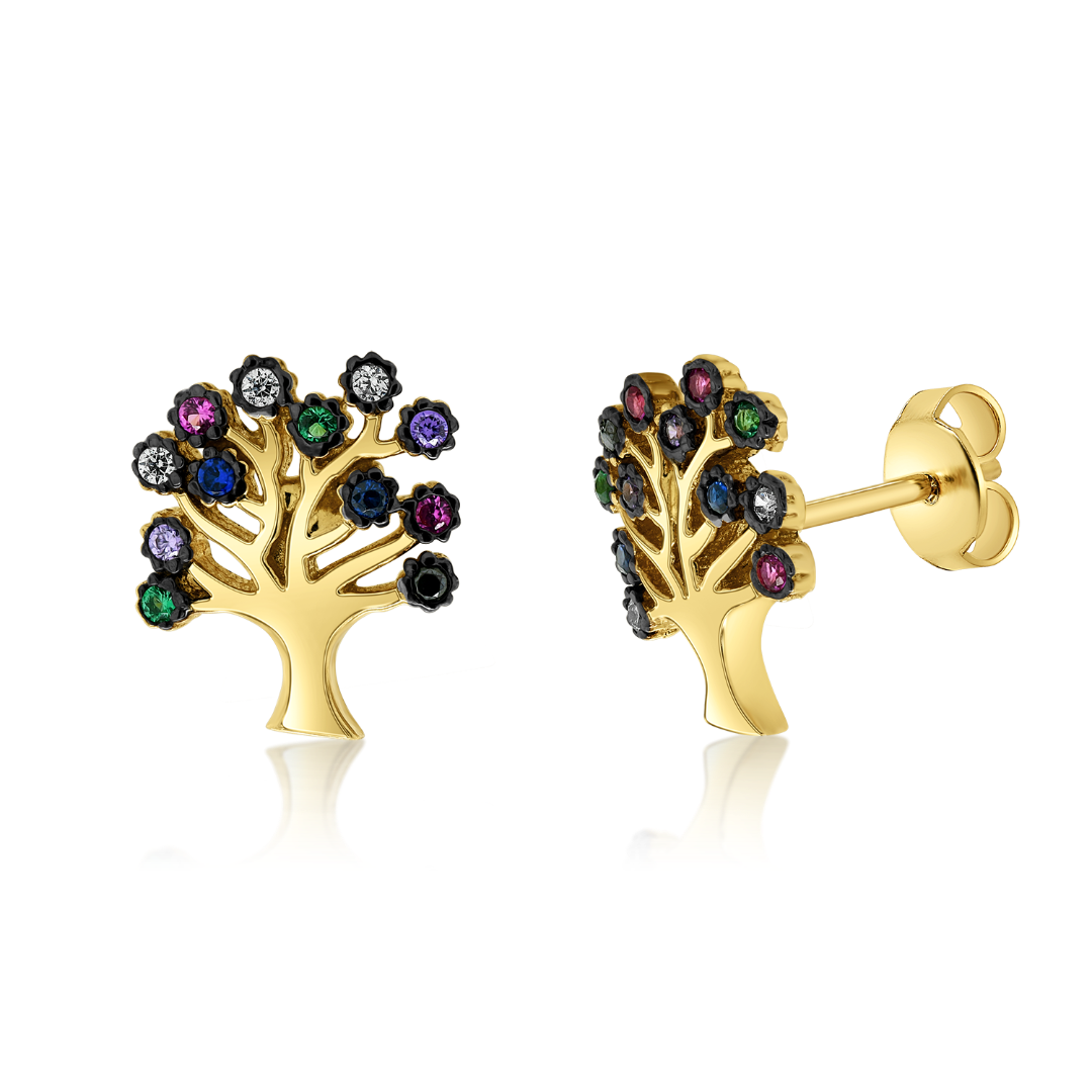 Cercei din aur  galben de 14K "copacul vieții" cu pietre Cubic Zirconia colorate.