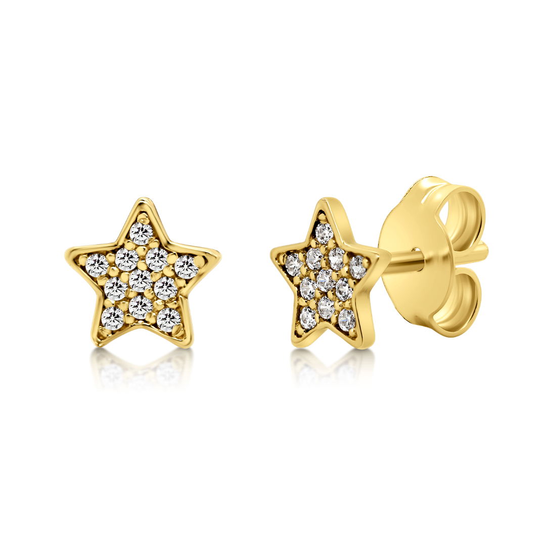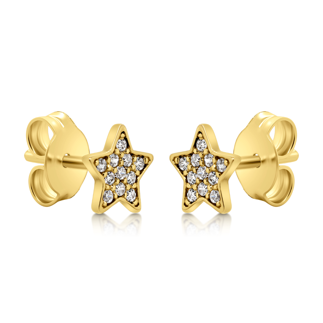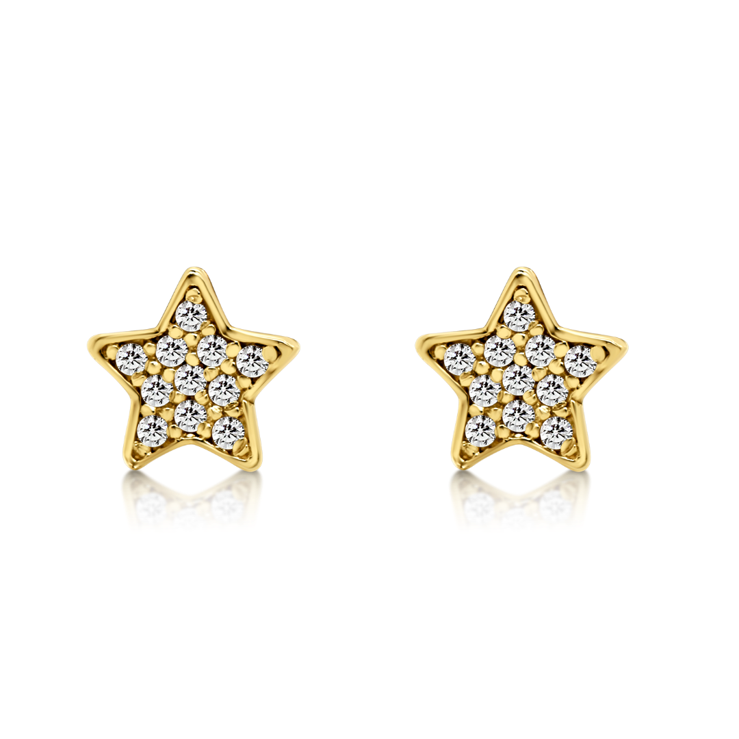 Cercei în formă de stea din aur galben de 14K cu pietre cubic zirconia.