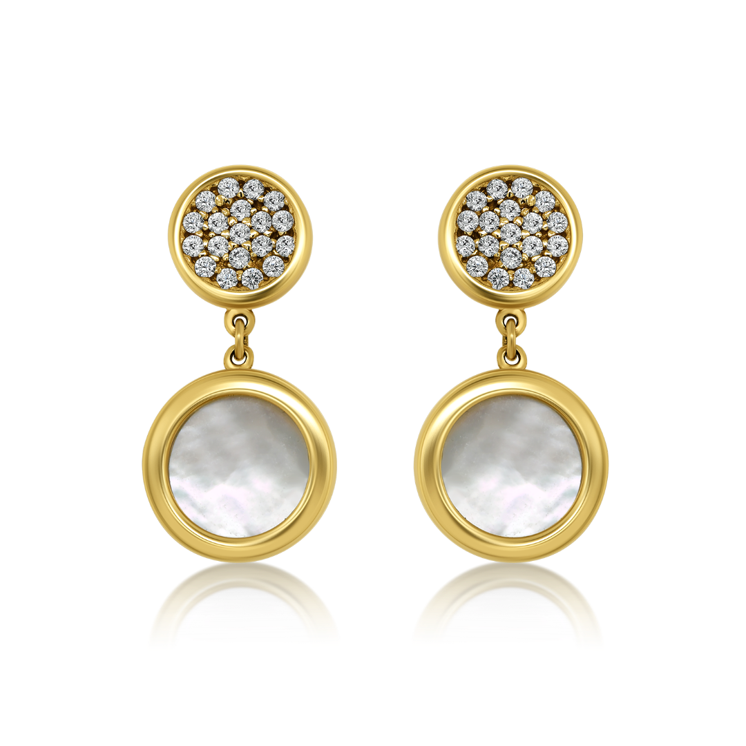 Cercei din aur galben de 14K, cu pietre Cubic Zirconia albe și sidef.