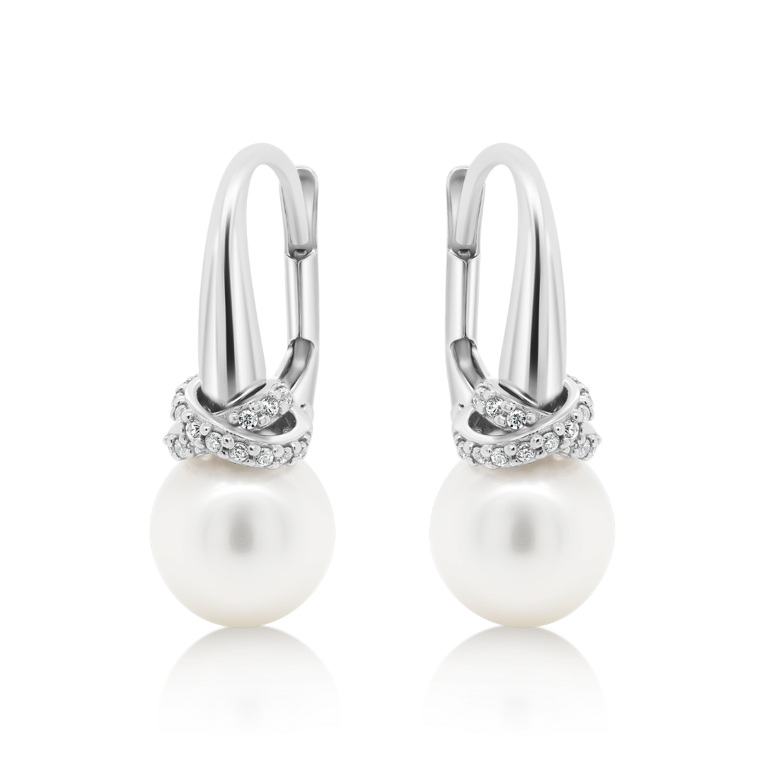 Cercei din aur alb de 14K, cu pietre Cubic Zirconia și Perle de cultură.