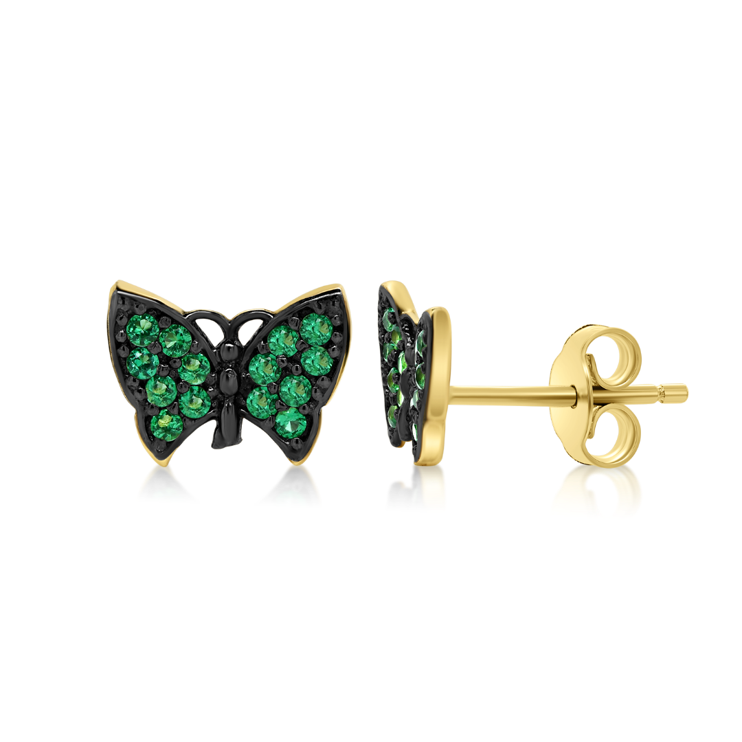 Cercei în formă de fluture din aur galben de 14K, cu pietre Cubic Zirconia verzi și rodiu negru.