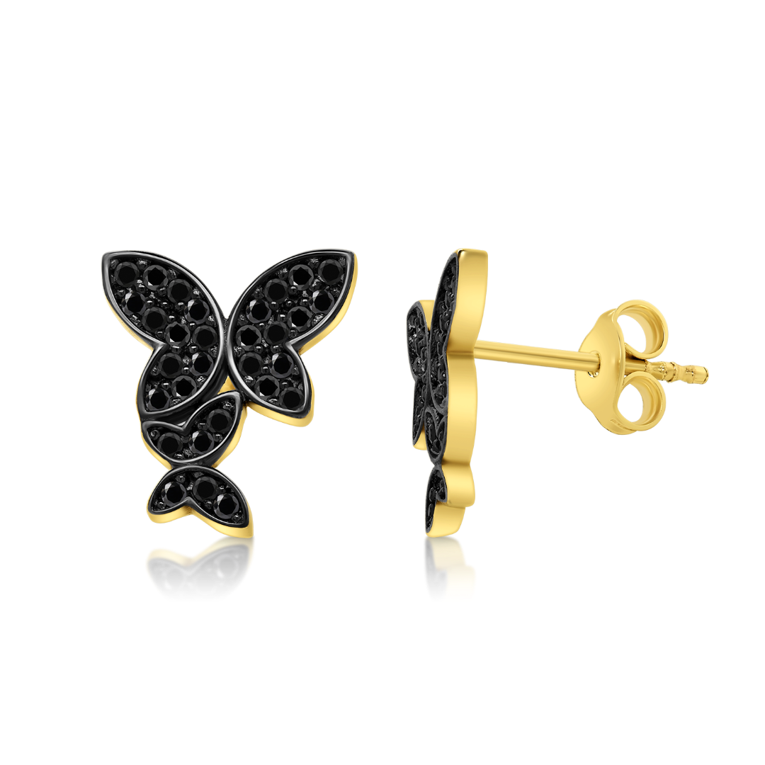 Cercei din aur galben de 14K tip fluturi cu pietre Cubic Zirconia negre și rodiu negru.