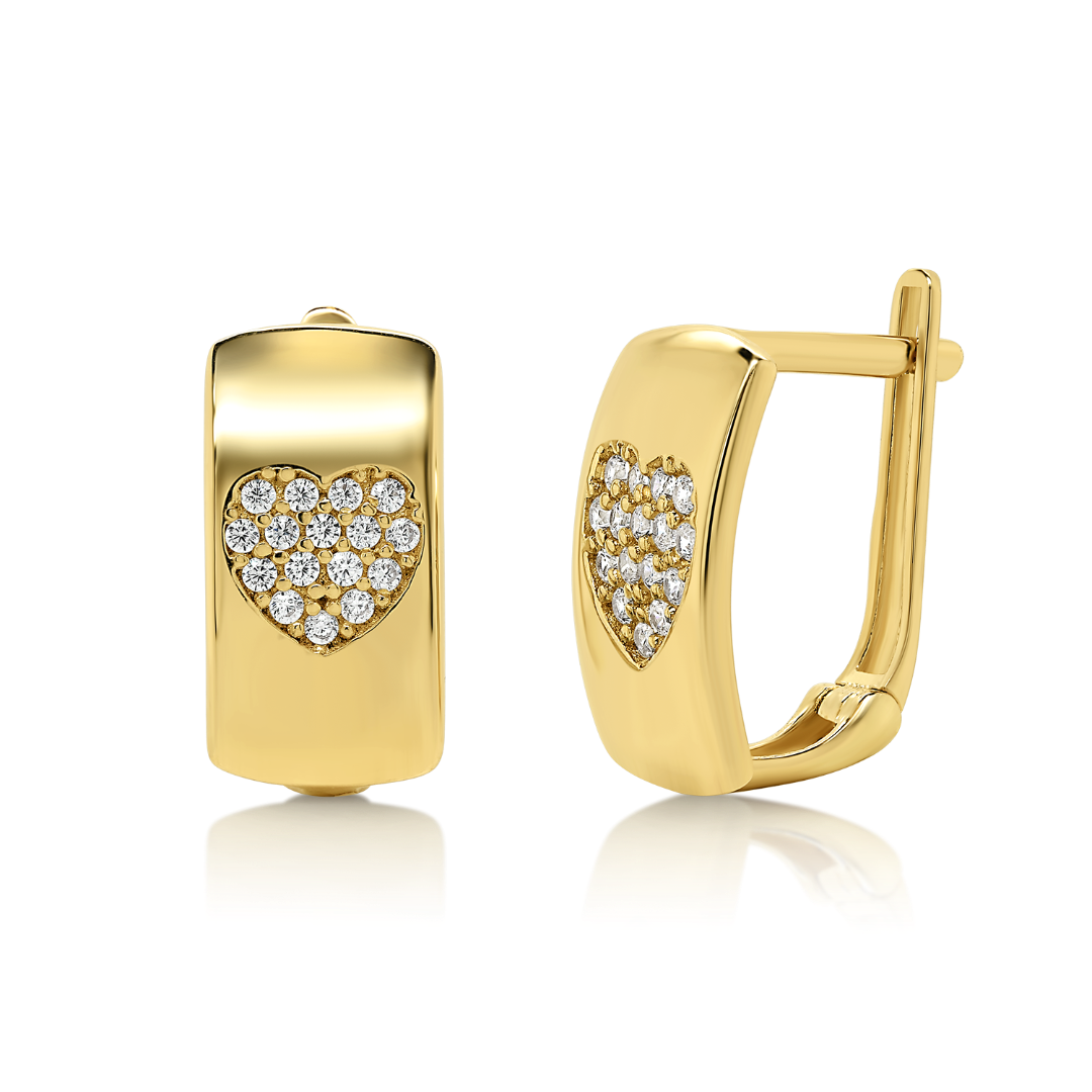 Cercei din aur galben de 14K cu element inimă și pietre Cubic Zirconia albe.