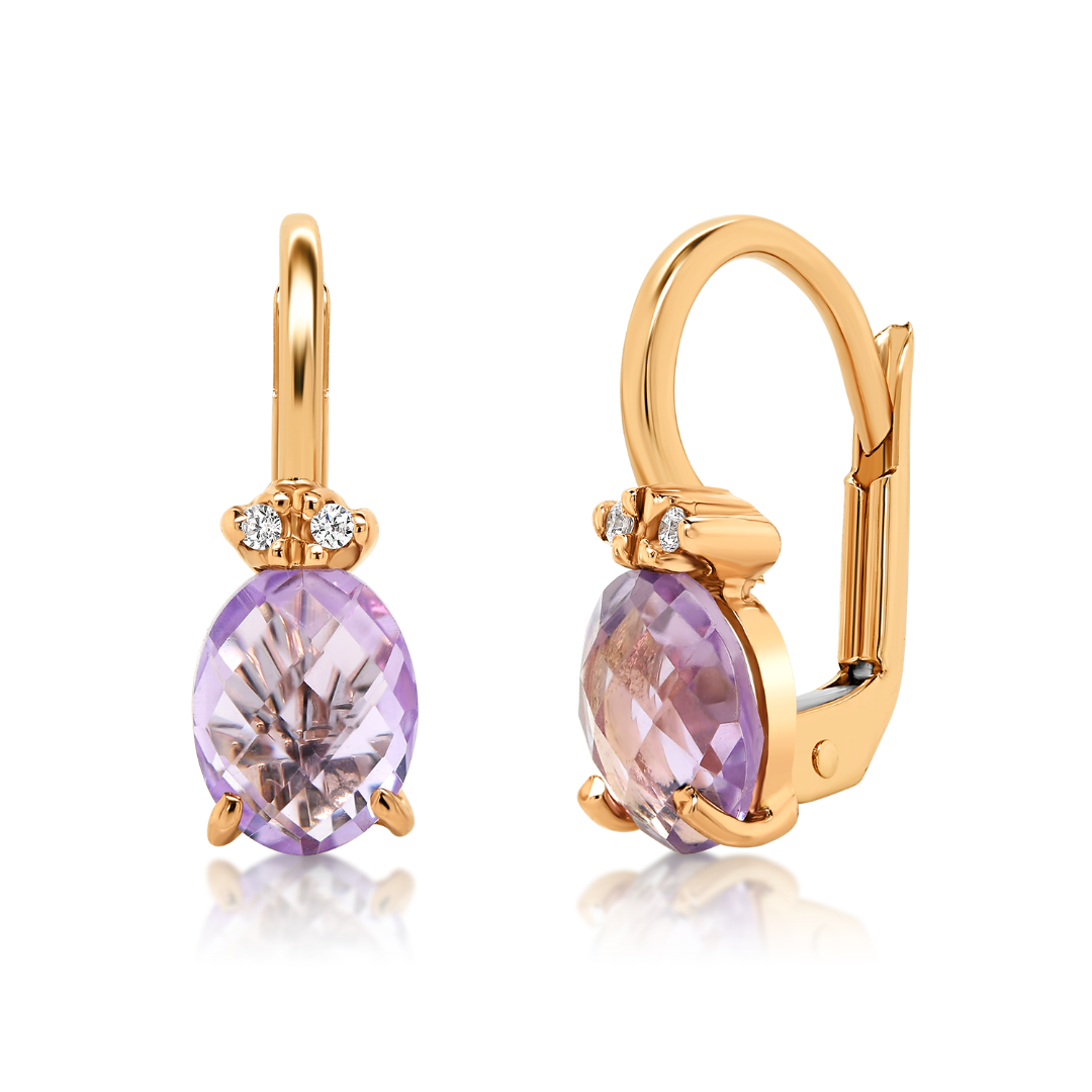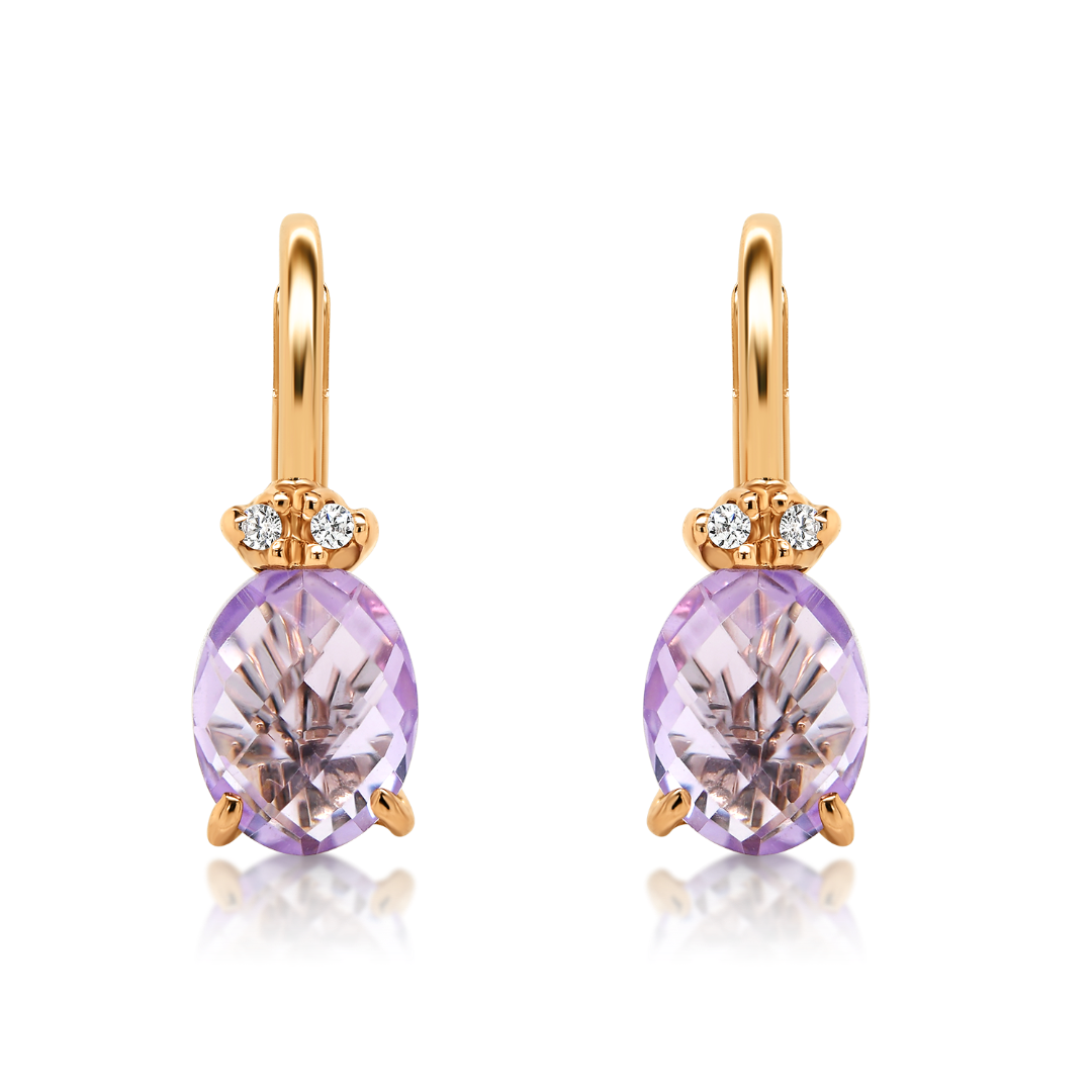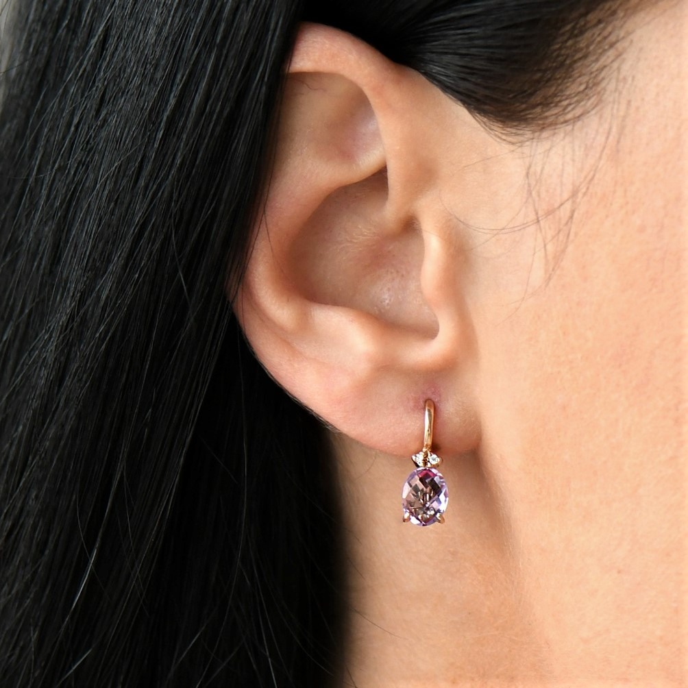 Cercei din aur roz de 14K, cu pietre Ametist și Cubic Zirconia albe.