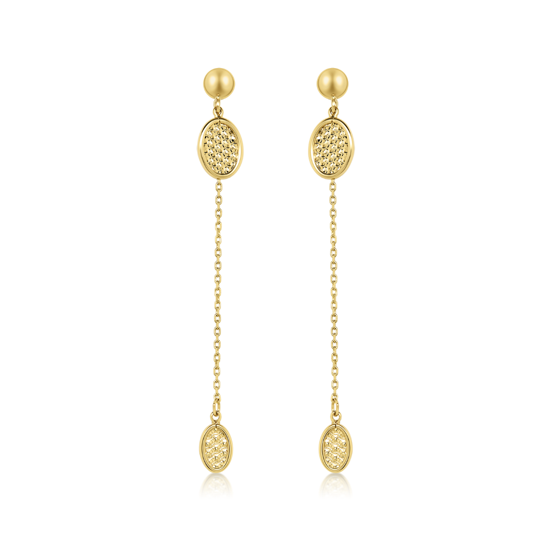 Cercei din aur galben de 14K, cu lanț și elemente ovale fațetate.