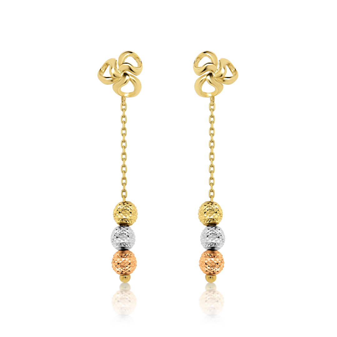Cercei din aur galben de 14K, cu element floare și biluțe fațetate.