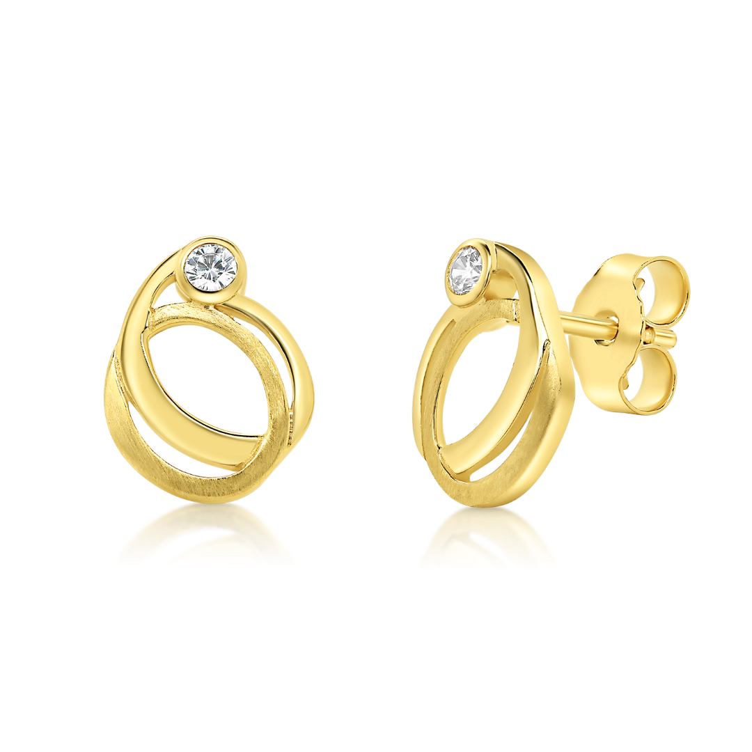 Cercei din aur galben de 14K cu elemente geometrice mate și pietre Cubic Zirconia albe.