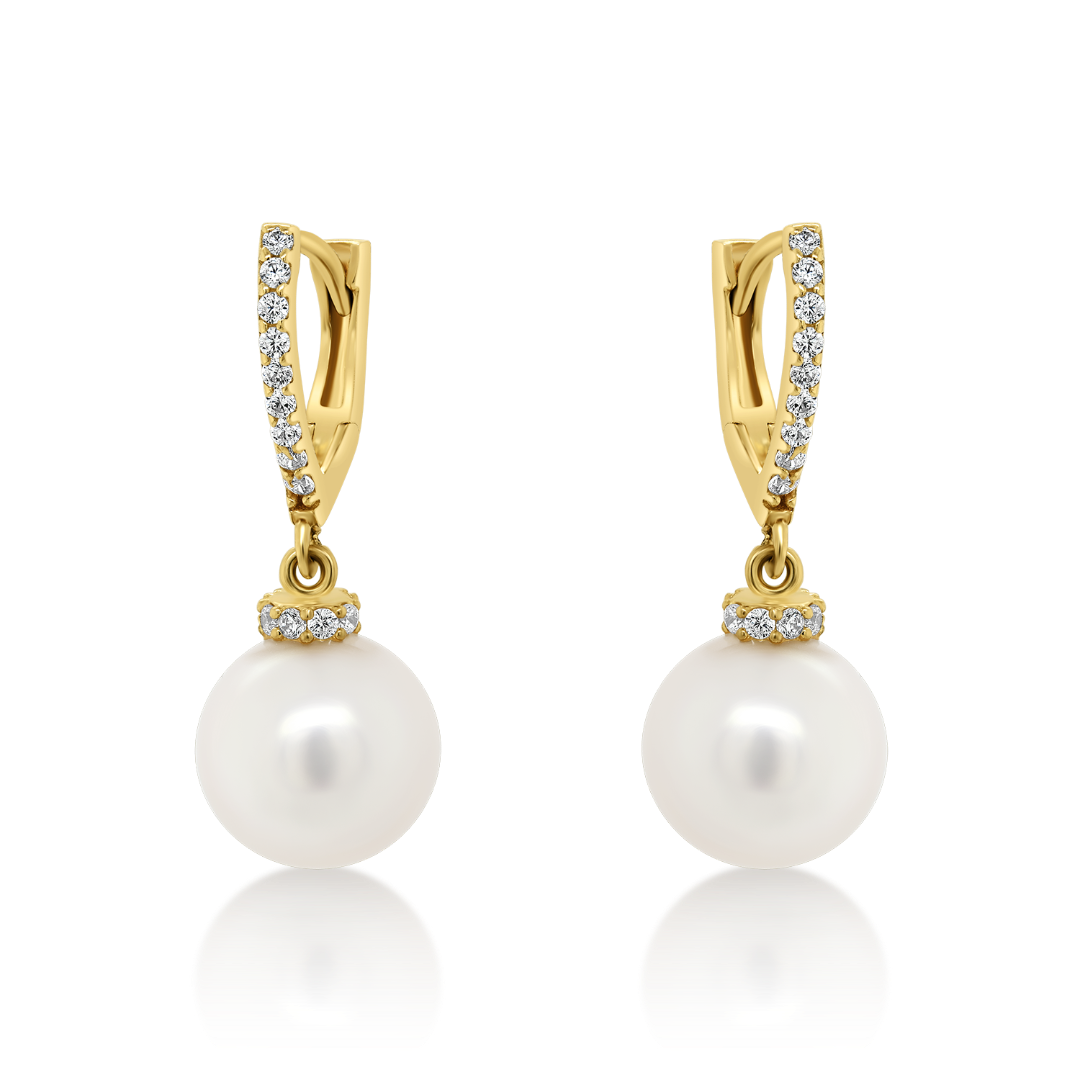 Cercei din aur galben 14K cu Perle și pietre Cubic Zirconia albe.
