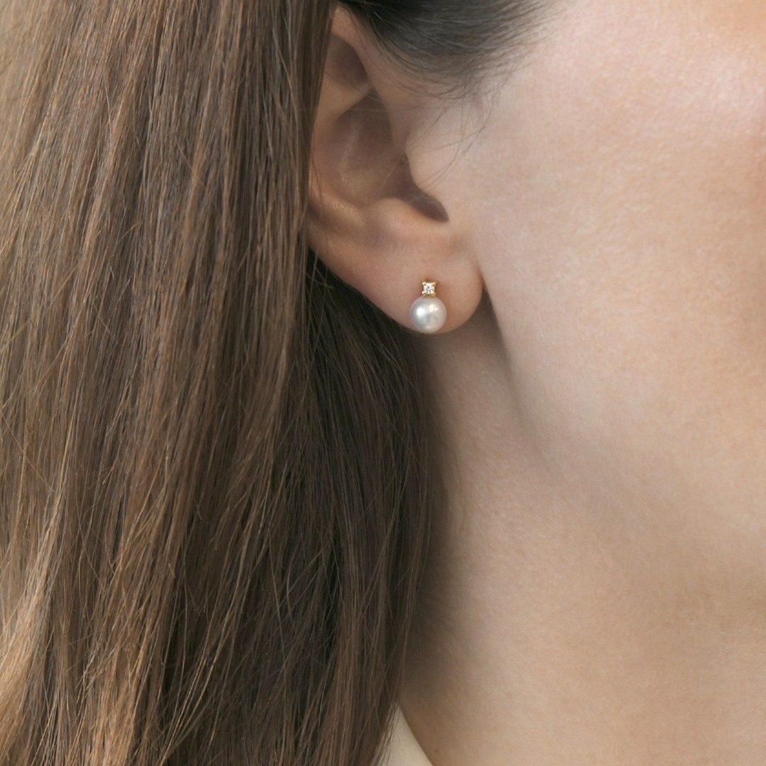 Cercei din aur alb de 18K, cu două Diamante Round Brilliant de 0.04ct și Perle de cultură.