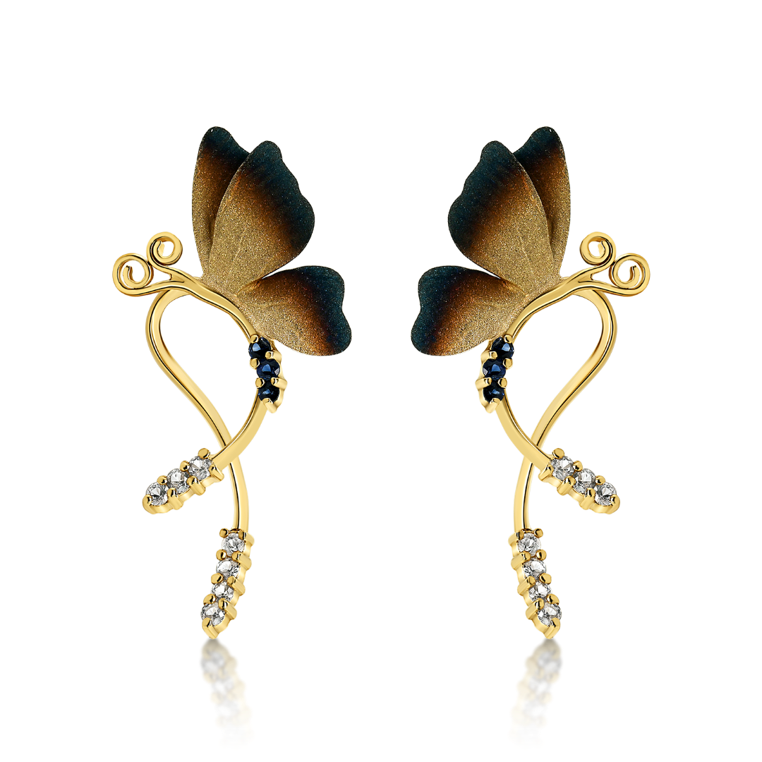 Cercei din aur galben de 14K, încrustați cu 14 Safire albe de 0.30ct și 6 safire albastre de 0.12ct.