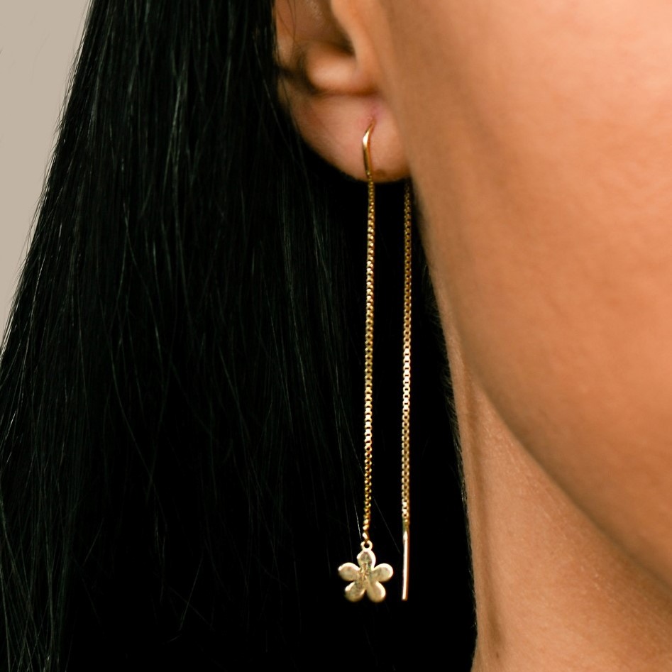 Cercei din aur galben de 14K, cu lanț și pandante în formă de floare.
