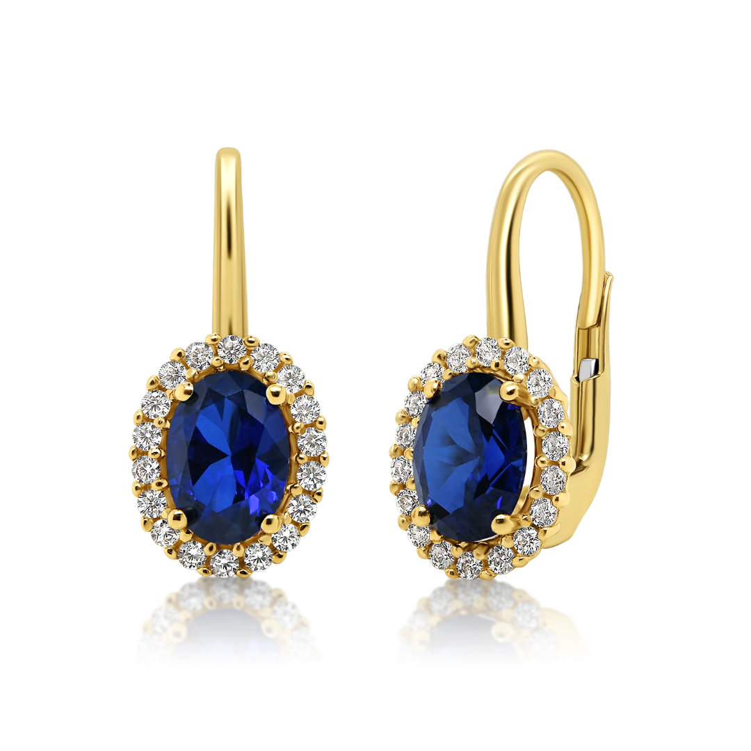 Cercei din aur galben de 14K, cu pietre Cubic Zirconia albe și albastre.