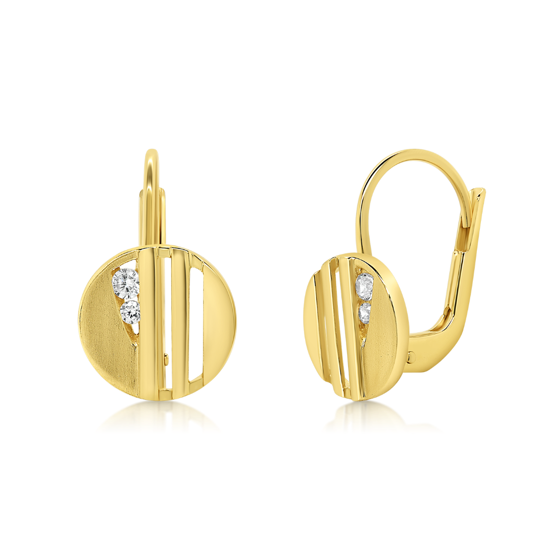Cercei din aur galben de 14K, cu elemente mate și pietre Cubic Zirconia.