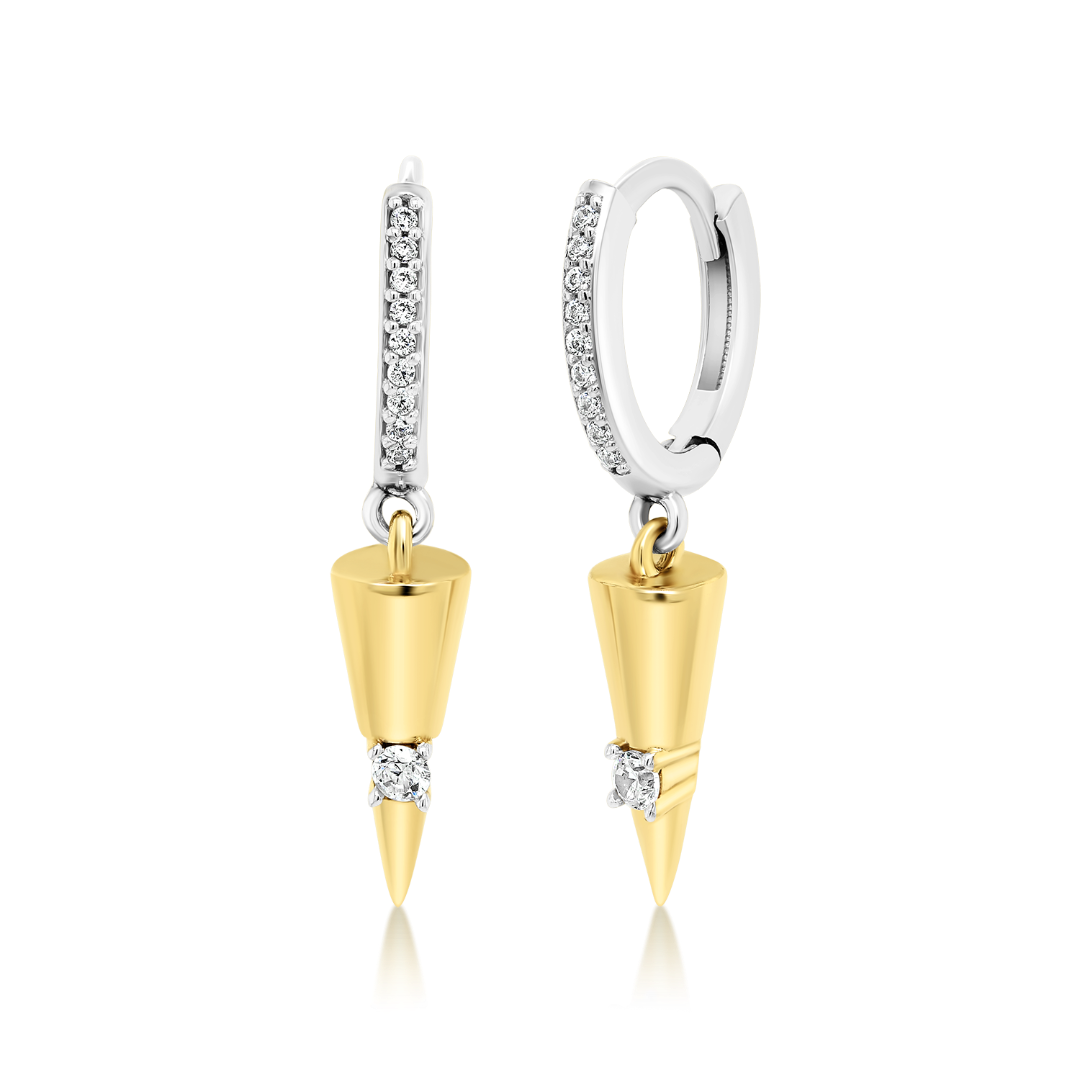 Cercei din aur alb de 14K, cu elemente din aur galben și pietre Cubic Zirconia.