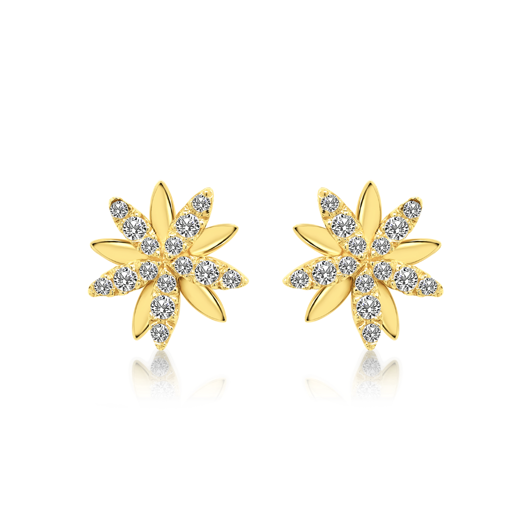 Cercei în formă de floare din aur galben de 14K cu zirconia incolore.
