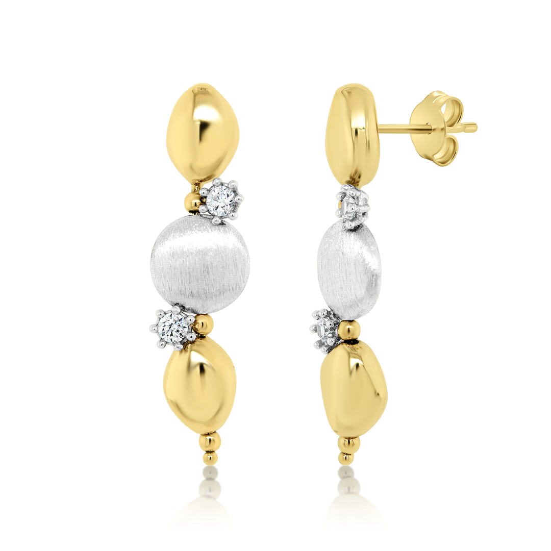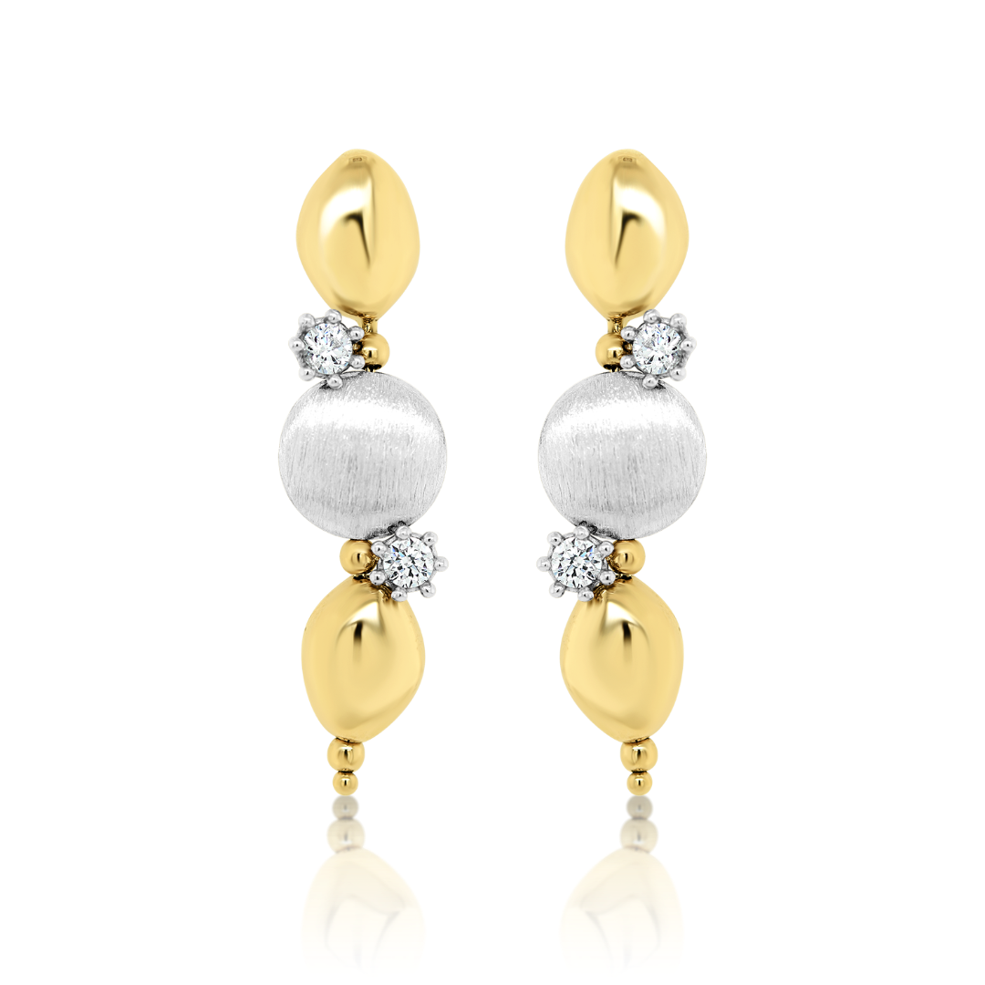 Cercei din aur galben de 14K, cu elemente satinate din aur alb și pietre cubic zirconia.