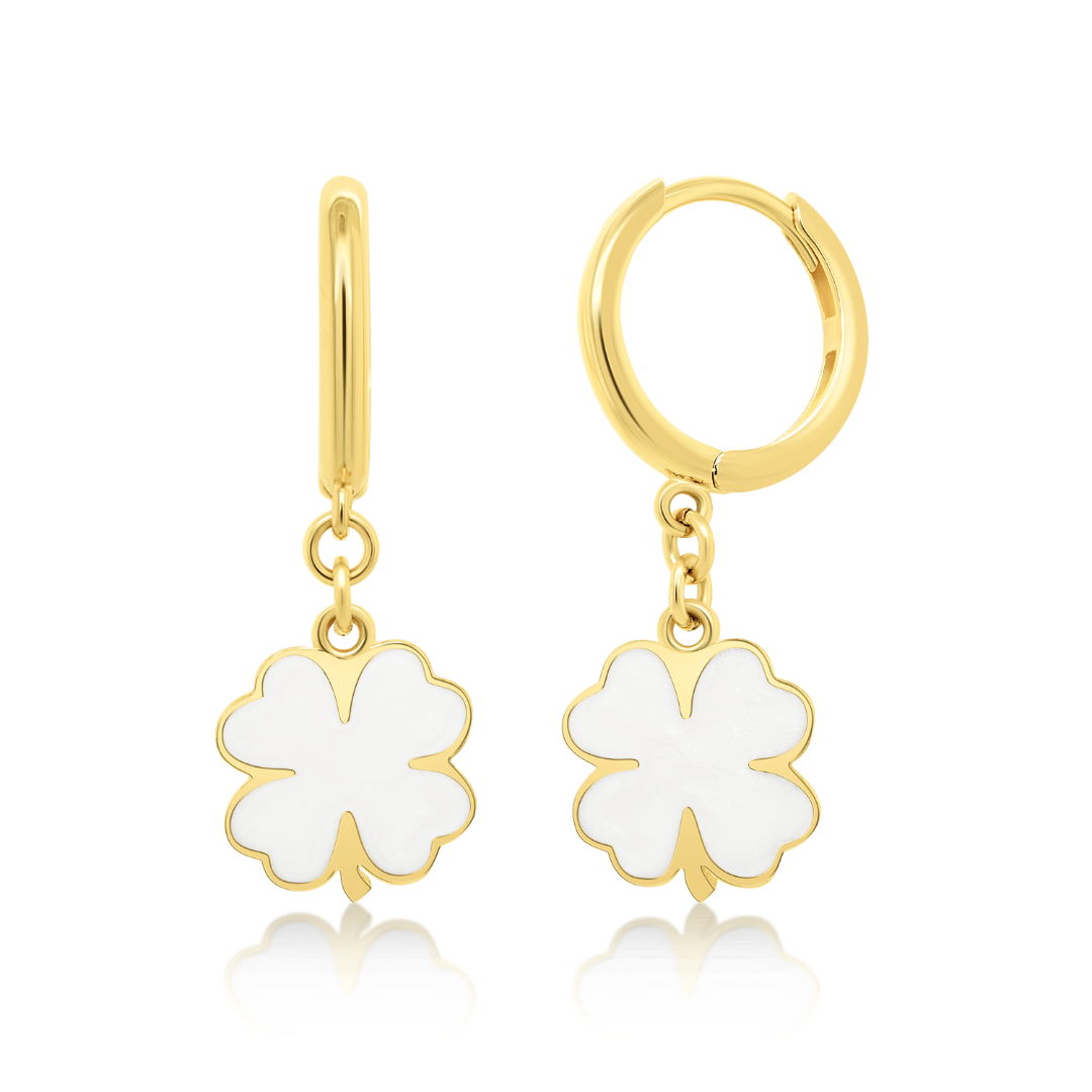 Cercei din aur galben de 14K cu pandantive în formă de trifoi cu Email alb.