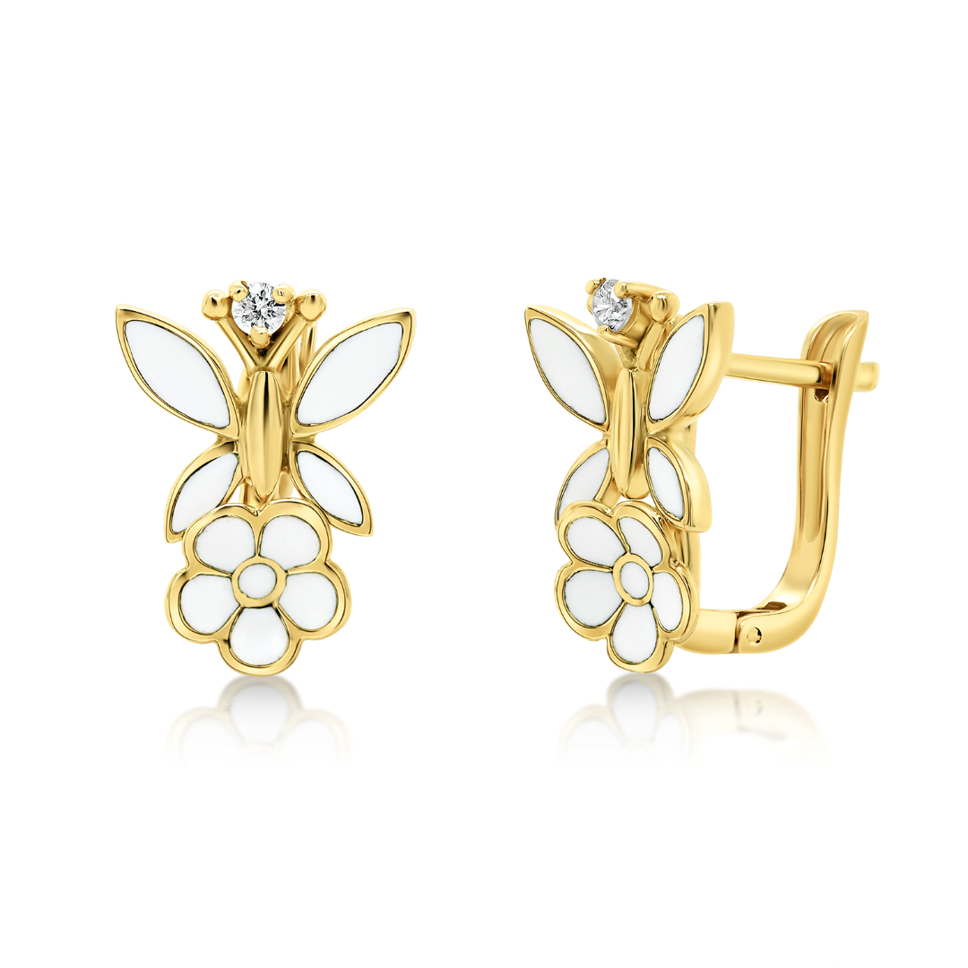 Cercei din aur galben de 14K cu Email alb și Diamante naturale