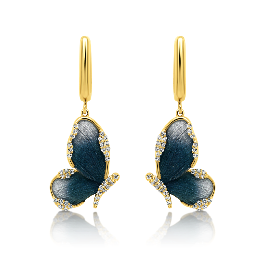 Cercei în formă de fluture din aur galben de 14K, încrustați cu Safire incolore de 0.36ct.