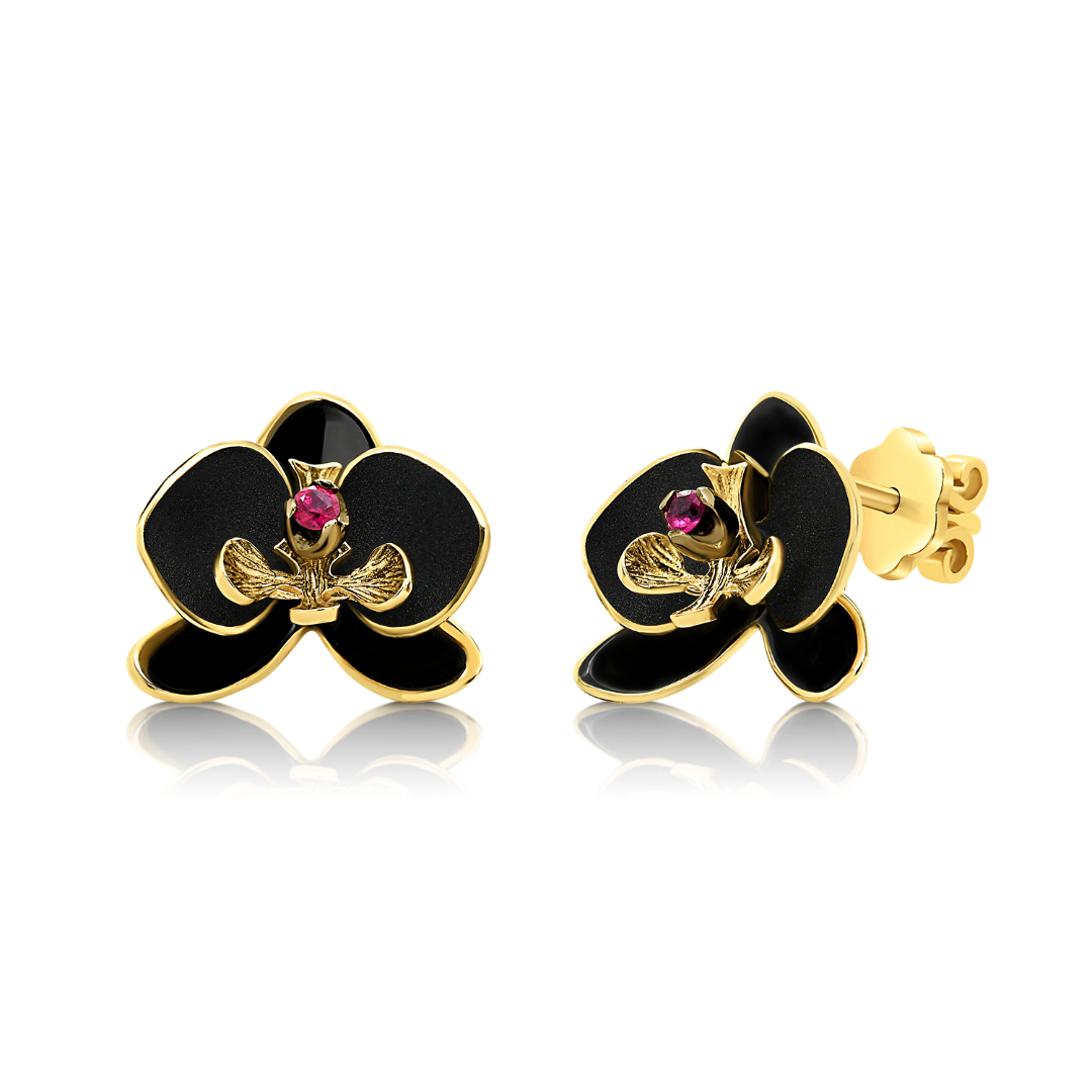 Cercei din aur galben de 14K, cu două Safire roz de 0.09ct și Email negru.