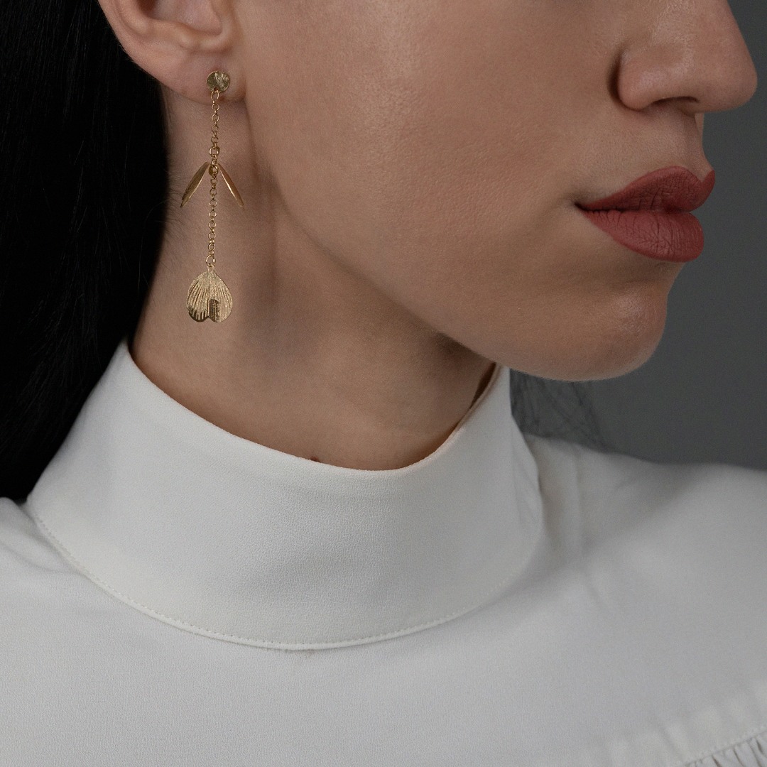 Cercei realizați manual din aur galben de 14K, cu elemente în formă de fluturi.
