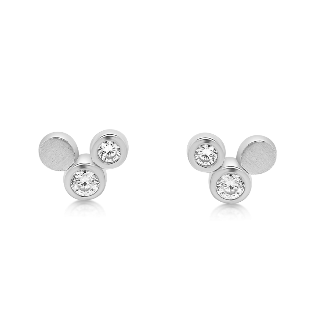 Cercei din aur alb de 14K, cu elemente mate și pietre cubic zirconia.