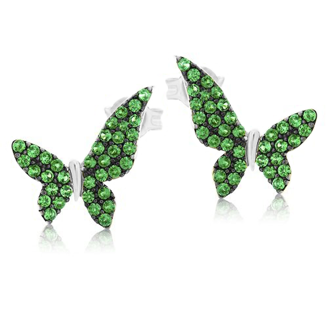 Cercei în formă de fluture din aur alb de 14K cu pietre cubic zirconia verzi.