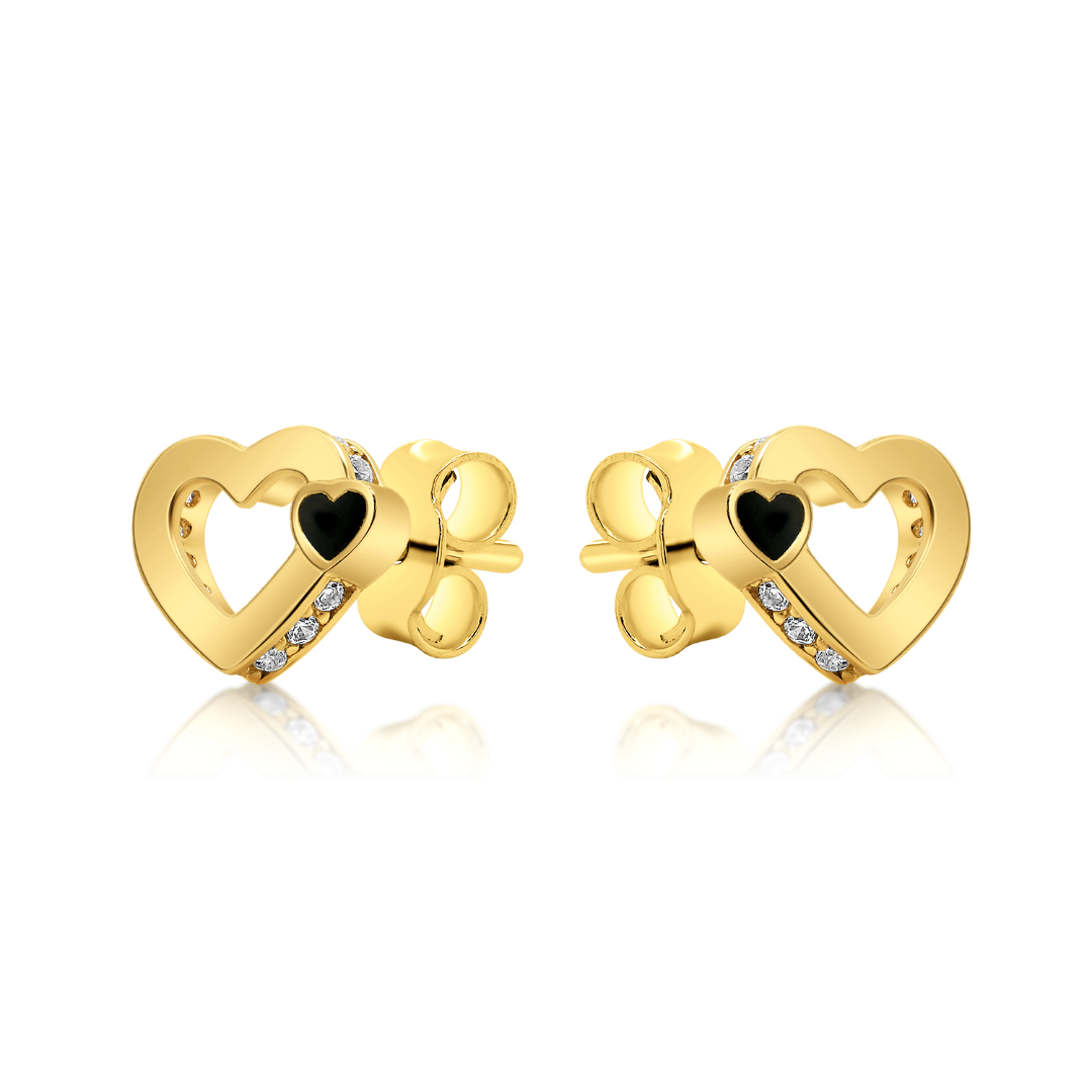 Cercei în formă de inimă din aur galben de 14K, cu pietre Cubic Zirconia albe și Email negru.