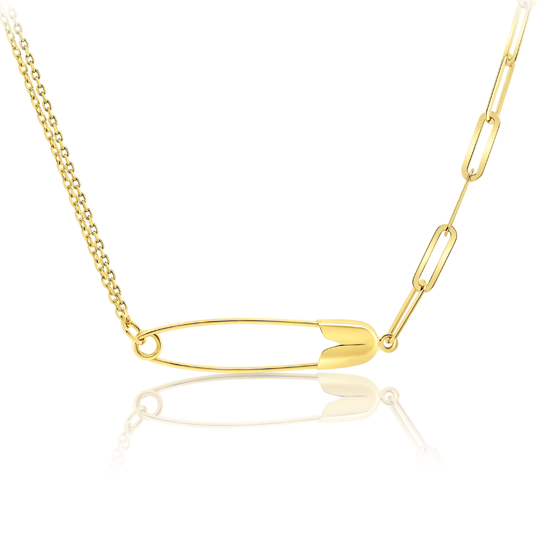 Colier cu două tipuri de lanț din aur galben de 14K și element ac de siguranță.