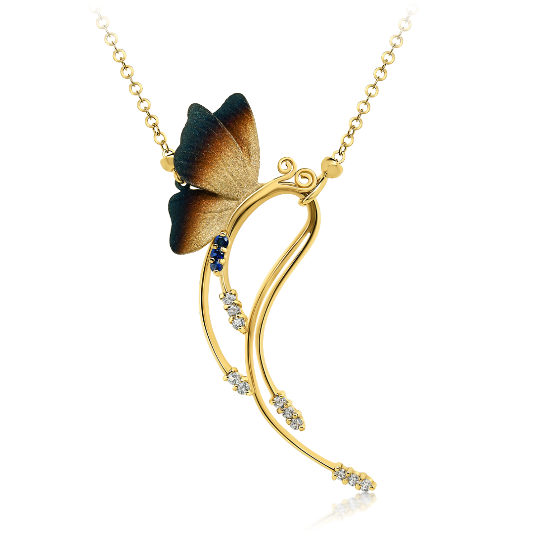 Lanț din aur galben de 14K și pandantiv cu 14 Safire incolore și albastre de 0.29ct.