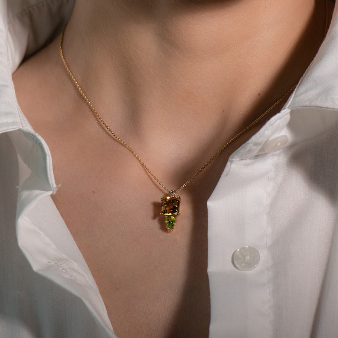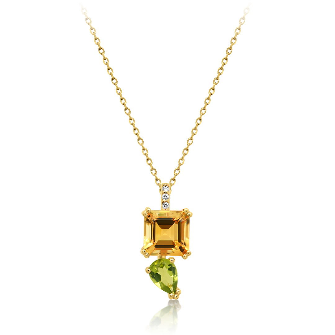 Lanț din aur galben de 14K și pandantiv cu Peridot, Citrin și pietre Cubic Zirconia incolore.