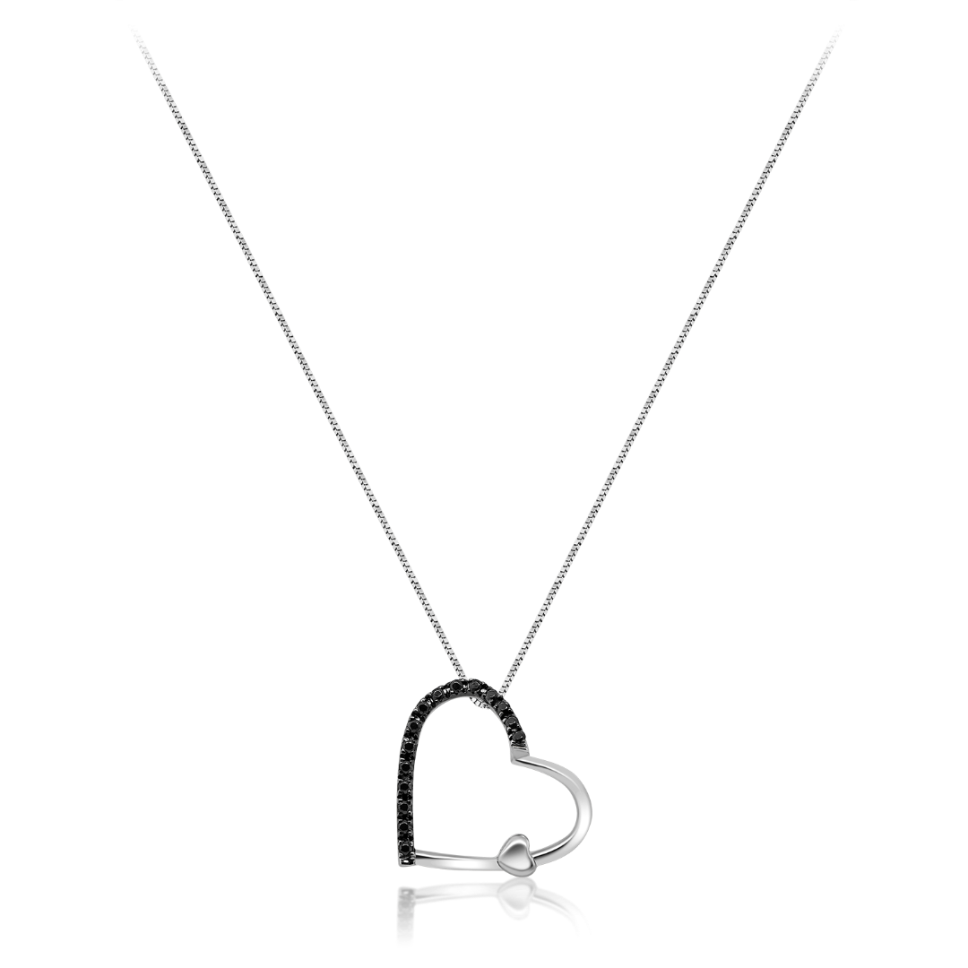 Lanț din aur alb de 14K și pandantiv în formă de inimă cu pietre Cubic Zirconia negre.