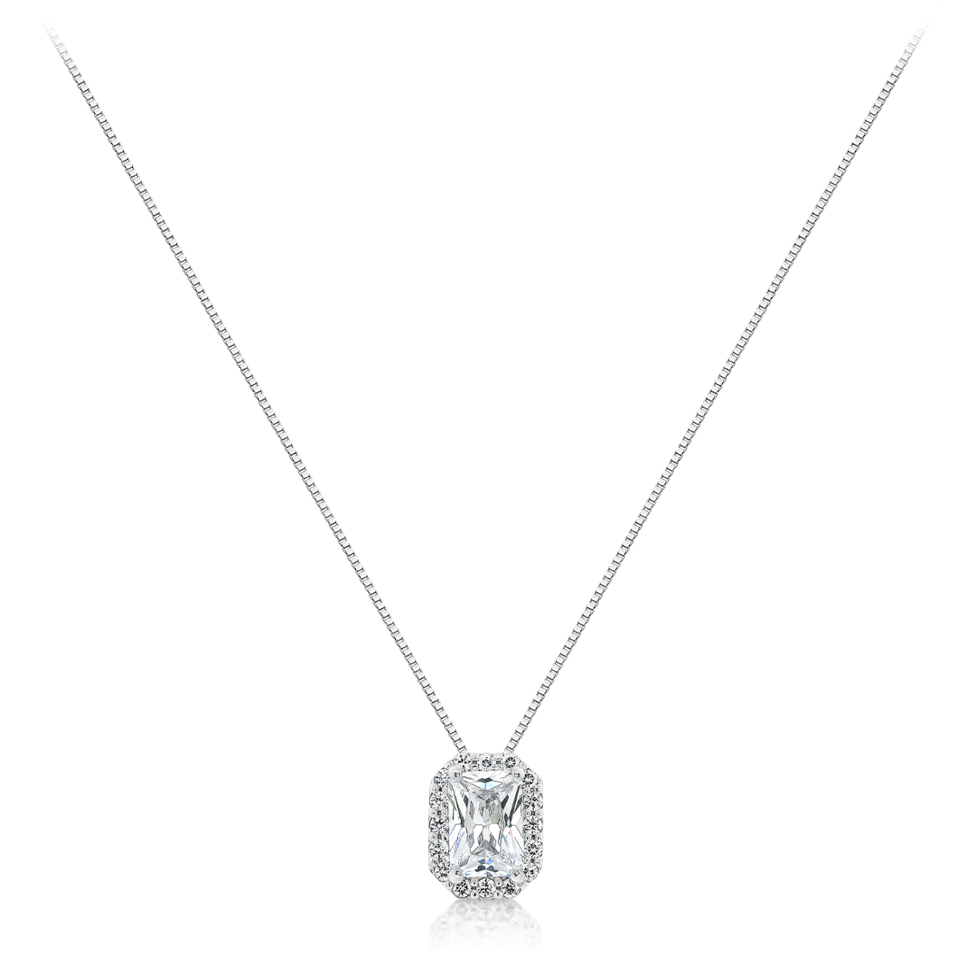Lanț din aur alb de 14K și pandantiv cu pietre Cubic Zirconia albe.