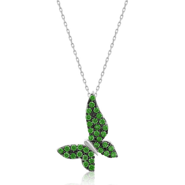 Lanț din aur alb de 14K și pandantiv fluture cu pietre Cubic Zirconia verzi.